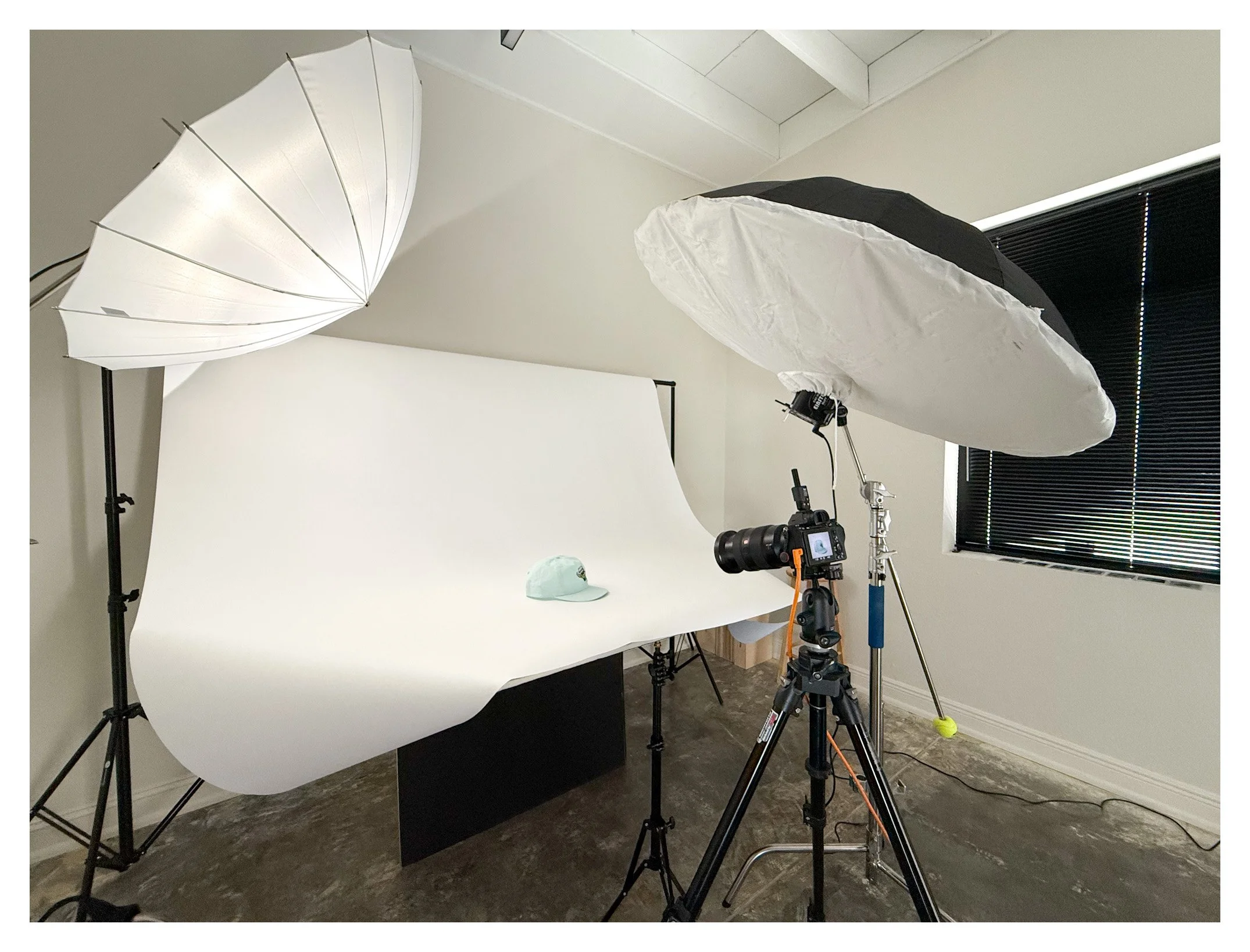 We kept this shoot simple but polished. I set up my portable backdrop right in the studio, giving the hats a clean, professional look while still keeping things light. Javi (the guy behind Pop Rally) hung out during the shoot and helped style the hats. It was a true collaboration — the kind of session where the personality of the brand shines through the photos.